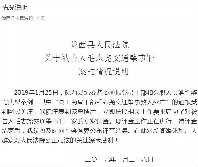 26日,陇西县人民法院官方微信发布情况说明,称立即按照相关工作要求启动了对被告人毛志尧交通肇事罪一案的专案评查。
