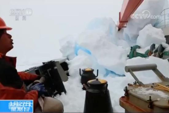不过完全依靠人力,进展很慢。好在老队员有经验,用船上的水泵直接抽取海水冲刷冰块间的积雪,节省了不少时间。
