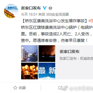 [2死2伤!张家口一洗浴中心发生爆炸]据@张家口发布 ,1月30日16时许,河北省张家口市桥东区红旗楼康美洗浴中心锅炉(电锅炉)发生爆炸,救援人员已赶赴现场处置。目前,事故造成2人死亡、2人受伤,伤者已送往医院救治。事故原因正在调查中。愿遇难者安息,伤者早日康复!