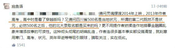 很多网友评论说,“对对对,绝对真实,里面2013年主角就看过2014年的片了”、“改编不是乱编,戏说不是胡说”、“我信你个鬼”。