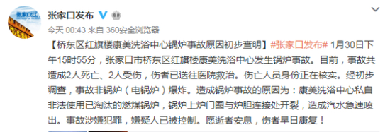 @张家口发布 1月31日消息,1月30日下午15时55分,张家口市桥东区红旗楼康美洗浴中心发生锅炉事故。目前,事故共造成2人死亡、2人受伤,伤者已送往医院救治。伤亡人员身份正在核实。经初步调查,事故非锅炉(电锅炉)爆炸。造成锅炉事故的原因为:康美洗浴中心私自非法使用已淘汰的燃煤锅炉,锅炉上炉门圈与炉胆连接处开裂,造成汽水急速喷出。事故涉嫌犯罪,嫌疑人已被控制。