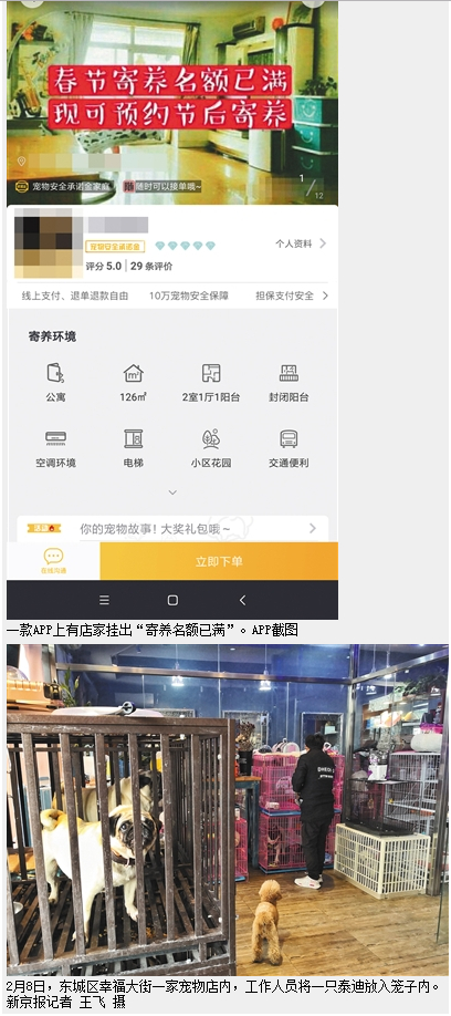 2月7日,新京报记者随机下载2款提供上述相关服务的APP,有些商家在平台上挂出“春节寄养名额已满,现可预约节后寄养”的提示语,还有些商家表示,春节不打烊,现在下单,当天就可以上门投喂。