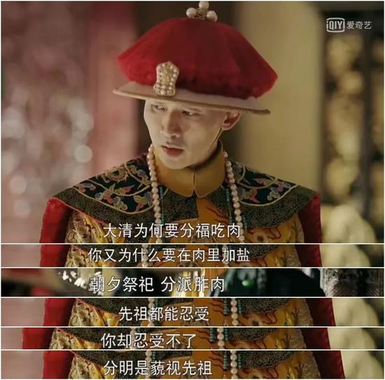 有趣的是,剧中如此维护祭祀正统的乾隆,在真实的历史中曾有这样的一幕:乾隆十二年十月初一,乾隆在重华宫进晚膳,膳桌上放着当天坤宁宫祭祀用的猪肉和羊肉。皇上吃了猪肉后,总管张玉柱等钦奉上谕说:“祭祀猪肉骚气,不好吃。钦此。”