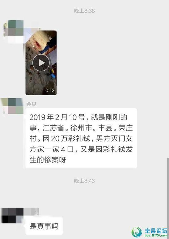 近日,丰县各微信群内疯传一则信息,内容统一为“2019年2月10号,就是刚刚的事,江苏省。徐州市。丰县。荣庄村。因20万彩礼钱,男方灭门女方家一家4口,又是因彩礼钱发生的惨案呀”。