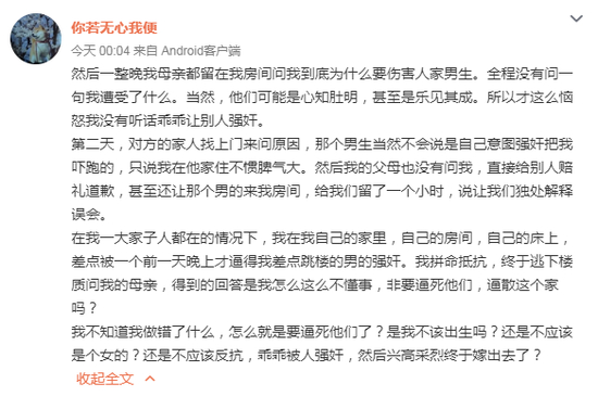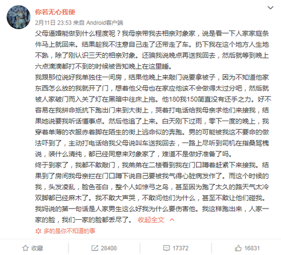 “你若无心我便”11日发文称,“父母逼婚能做到什么程度呢?”,讲述了其被父母逼婚,随后险些遭相亲对象强奸。“你若无心我便”在文中称,母亲将她带到相亲对象家中,随后自己悄悄回家,将她扔到认识三天的相亲对象家中。夜里,她险些被相亲对象强奸,奋力挣脱后回到家中,结果母亲不问女儿遭遇,反而责怪其从男方家跑出来,丢尽家里面子。