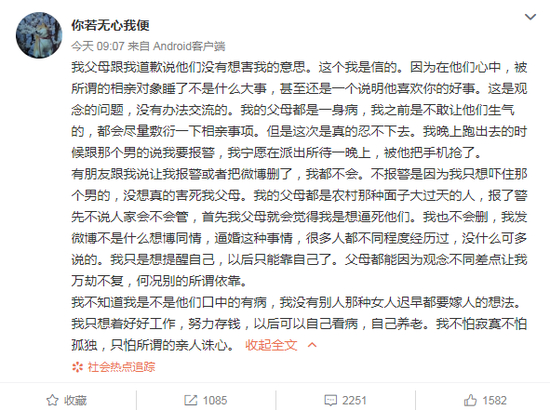 春节期间,不少网友回乡都遇到父母逼婚,“你若无心我便”的帖子发出后引发很多网友共鸣,更是为其遭遇揪心,并建议其报警处理。“你若无心我便”在随后的帖子中表示,因担心父母想不开,自己并未报警。