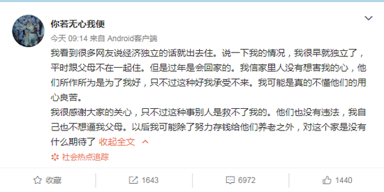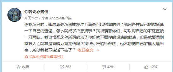 说我造谣的,如果真是造谣转发过五百是可以拘留的吧?我只是在自己的微博说一下自己的遭遇,怎么就成了故意搞事?我很羡慕你们,可以对自己的家庭直接一刀两断。我也恨死这种所谓的为了你好就不顾你的想法的做法,但是就要闹到家破人亡就算是有魄力有觉悟吗?我很讨厌这种做法,也不想把自己家里人逼出事,所以我就不该活下去了?