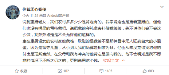 说到重男轻女,我们农村多多少少是肯定有的。我家肯定也是更看重男的。但他们也没有明显的亏待我吧。说把我的彩礼拿去补贴我弟弟,先不说他们会不会这么做,我弟弟肯定是不会允许他们这样的。