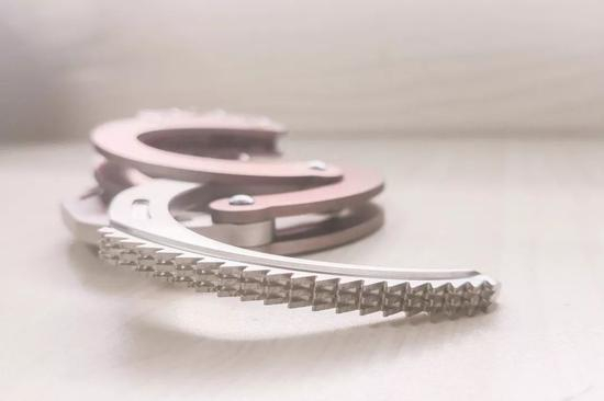 相比与以往的纯银手铐和金手铐,此次的玫瑰金新品采用6061铝、0Cr18Ni9等材料,使其硬度大幅度提升,坚硬致密的材料使其更不易被一般器械所破坏,具有抗拉力强的绝对优势。经多名强壮警员徒手拉扯,铐环均未有丝毫挪动,齿轮咬合无任何缝隙。