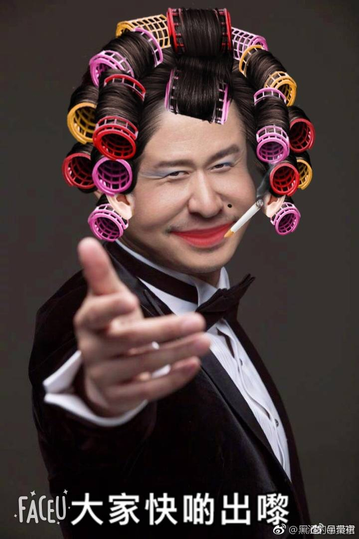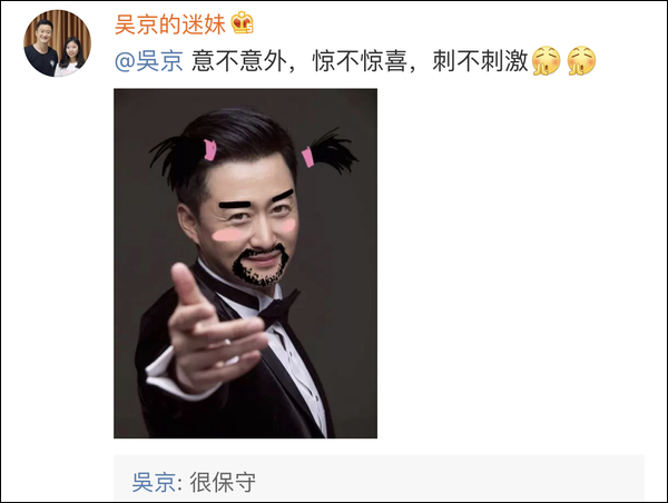 唯一一张被吴京本人“翻牌子”的是一副“软妹版吴京手”,梳着两个羊角辫扎着粉色发圈,却诡异地长了一圈络腮胡。