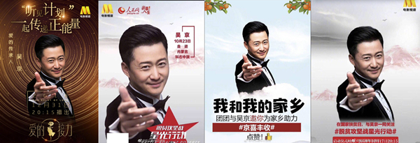 近几年,吴京出席各个活动的宣传海报几乎全都是一个模子里刻出来的。