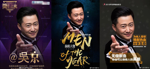 献血宣传员海报,微博之夜宣传海报,巅峰人物宣传海报……没有什么是“吴京手”这一个动作不能搞定的。