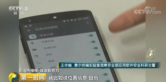 泰尔终端实验室信息安全部应用软件安全科研主管 王宇晓:一个简单的替换字体的应用软件,却几乎申请了所有的权限,比如位置信息、日历、电话、相机、短信、身体传感器跟通讯录,很多都跟它无关。