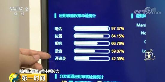 泰尔实验室对国内应用市场前1000个应用取样分析,结果显示,大量应用在安装使用时,申请了通讯录、摄像头等多项核心敏感权限。研究人员发现,部分App有向第三方软件开发公司传输用户数据的情况,但是第三方数据公司是否合法地使用这些信息,就难以监测了。