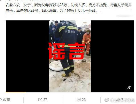 2月18日下午,六安市公安局金安分局微博辟谣称,近日,有网友在网上发布该局辖区内一居民家因彩礼问题跳井自杀的消息。经核查,死者已婚多年,育有两女,且患有一定程度精神类疾病,民警现场勘验后已排除他杀。网上传播的消息不实,望广大网友切莫听谣、信谣、传谣!