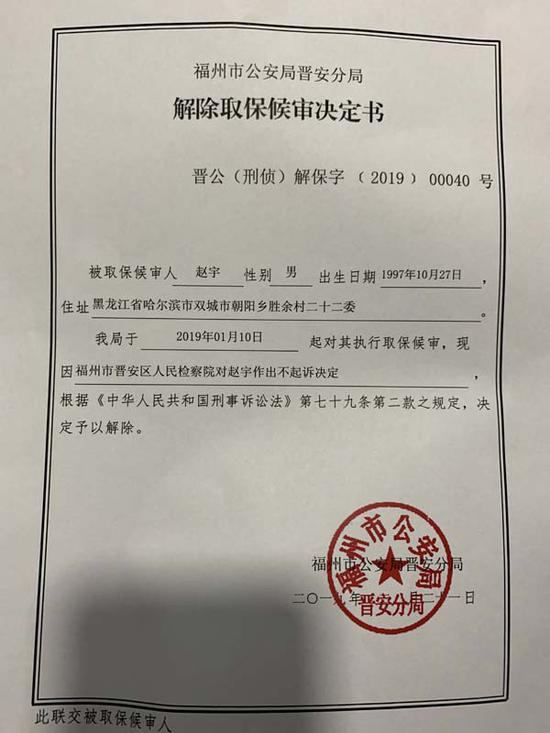 其中,《解除取保候审决定书》显示,福州市公安局晋安分局2019年1月10日起对其执行取保候审,现因福州市晋安区人民检察院对赵宇作出不起诉决定。根据《中华人民共和国刑事诉讼法》第七十九条第二款之规定,决定予以解除。