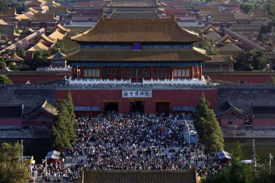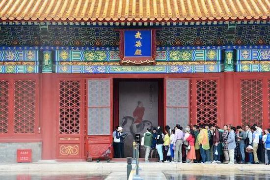 武英殿外,观众排队等待入场观看“石渠宝笈”展