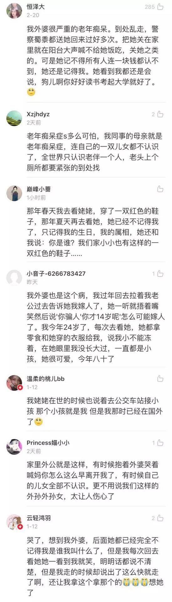 很多网友也分享了他们患有阿尔茨海默症的亲人的故事。