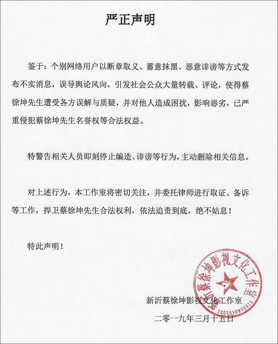 其工作室随后也发布声明,表示个别网络用户以断章取义、蓄意抹黑、恶意诽谤的方式发布不实消息,误导舆论风向,使得蔡徐坤遭受各方误解与质疑,并对他人造成困扰,影响恶劣,将依法捍卫其合法权利。
