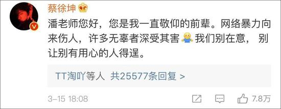蔡徐坤也在评论区写道:网络暴力向来伤人,许多无辜者深受其害,“我们别在意,别让别有用心的人得逞”。