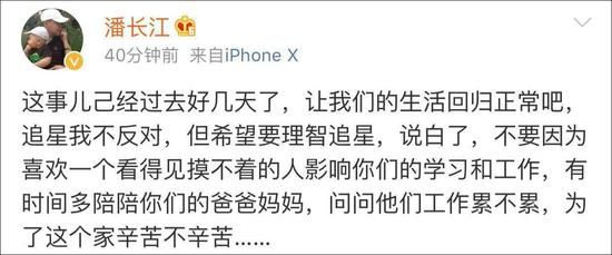 16日,潘长江再次回应此事,并呼吁大家理智追星,“不要因为一个看得见摸不着的人影响了你们的学习和工作,有时间多陪陪你们的爸爸妈妈。”
