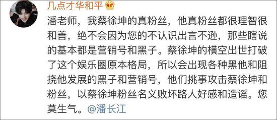 因此,此事发生后,不少网友都认为,应该是蔡徐坤的粉丝太过无理取闹——先不说潘长江应不应该、需不需要认识蔡徐坤,即使作为晚辈,在言语上对长辈也应该有尊重不是吗?