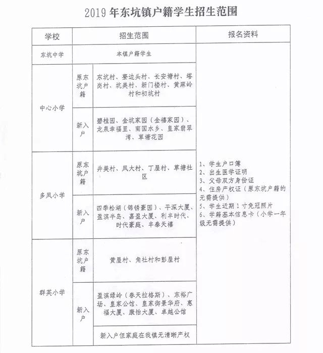 群英小学:黄屋村、角社村和彭屋村适龄儿童以及新入户到骏达社区但家庭在东坑镇无清晰产权的适龄儿童;