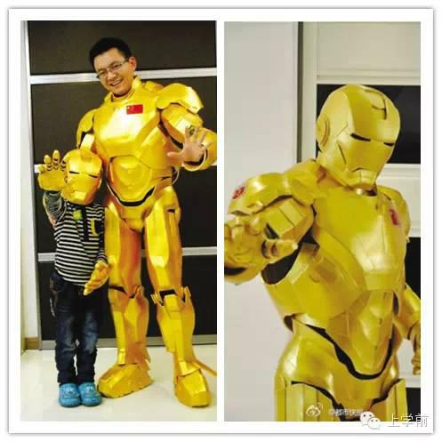 每个小男孩都有个超级英雄梦!为了给6岁的儿子圆梦,温州一位“80后”老爸也花了1个多月亲手制作了一件带有中国元素的钢铁战衣(胸口贴着五星红旗,掌心画上太极图),变身现实版“钢铁侠”。这套战衣有近1米8高,材料系EVA塑胶原料,总耗资仅300多元。嗯,身旁有这样一位“钢铁侠”老爸“护航”,走在路上绝对拉风哈!