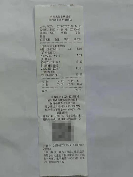 2月2日,西安市民肖绵明在永辉超市(纺渭路店)购买了54.76元的商品,肖绵明付给收银员55元现金,收到2角找零。肖绵明有保留购物小票的习惯,回家后他发现,永辉超市少给他找零4分钱。