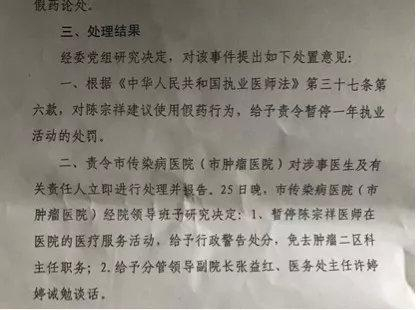 所以,目前陈医生遭到的处罚,在医院方面是被免除了科主任的职务,在官方层面则是依据《执业医师法》第37条第6款的规定,即“使用未经批准使用的药品、消毒药剂和医疗器械的” ,而被暂停了一年的执业活动。