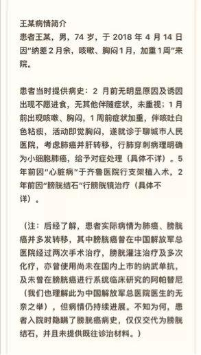 2018年7月23日:在持续进行了数月化疗后,王合禹老人肺癌的病情得到控制,但膀胱癌的病情有所增加。但老人之前已经在其他医院进行过膀胱癌的治疗,使用过多种化疗药物,都未能控制住病情,已经进入非常难以治疗的阶段。