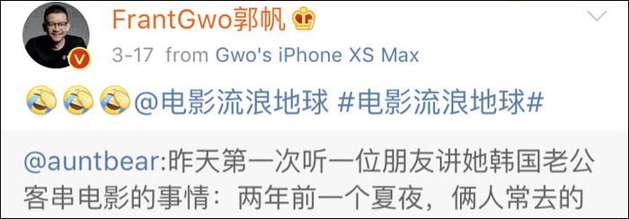 郭帆还转发了@auntbear的博文,配上了笑哭的表情。