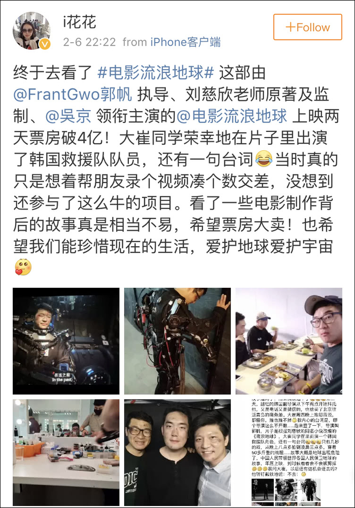 电影公映的时候,我回韩国休假了,没能第一时间看到,但是在韩国也看到新闻报道电影取得了很好的票房成绩。我想,一定是每个工作人员共同的努力,才能做出这样的作品,导演的魄力和能力,也用作品得到了验证。而至于我,很荣幸参与到这样的作品中,能被大家认识和喜欢,是我的荣光。如果能给你带去欢乐,那我也是幸福的。我还是努力工作,赚钱,养孩子,照顾父母。希望大家继续支持郭帆导演,期待《流浪地球》第二部。