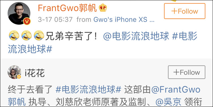 没想到,这个小插曲引起了《流浪地球》导演郭帆的注意。他转发了崔暻悰妻子的微博,感叹“兄弟辛苦了!”。