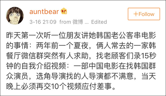 夫妻俩的好友@auntbear 16日爆料,崔暻悰的妻子@i花花 在接到选角导演的电话后,一度感到怀疑,“青岛遍地韩国人,干嘛从北京去啊?”因为崔暻悰是做外贸的,从来没演过戏,他的妻子搜了一下导演名字,判断这是个骗子剧组。