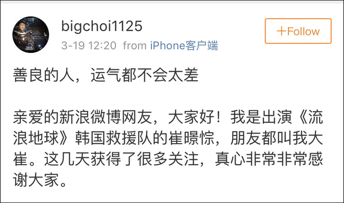 3月19日,在《流浪地球》中出演韩国救援队队员的崔暻悰@bigchoi1125 开了微博,他用中文发了一篇题为《善良的人,运气都不会太差》的长文详述自己阴差阳错参演了该片的经历。