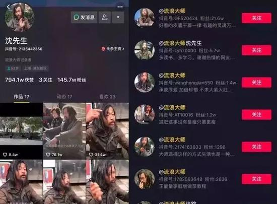 目前抖音上多个账号均发布了沈巍的相关视频,点赞量平均赞高达10万左右,最高的可以达到上百万。不少用户注册类似“流浪大师、沈先生”等名称的账号,发布与其相关的视频获取点击量,然而此类账号无一是沈巍本人所有,均为网友冒名注册而来。