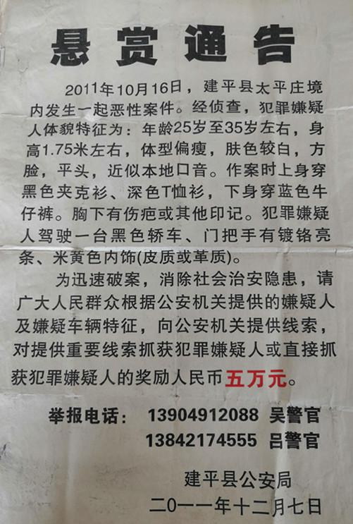 据宋金恒家属了解,王亚娟的父亲当时是建平县公安局警察,案发后曾多次找到公安局领导,要求尽快破案,并施加压力称破不了案就去公安部上访。为此,县公安局在全县范围内发出悬赏5万元的通告,通告中明确标出犯罪嫌疑人的体貌特征:胸下有伤疤或其他印记。