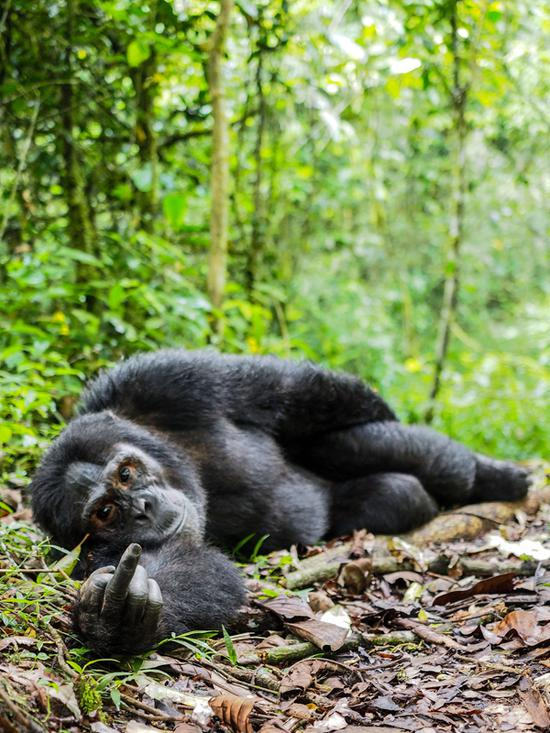 2019年3月21日报道,总是被偷拍,动物们也表示不开心啦! 这组有趣的照片显示,猩猩们纷纷用竖中指的方式来表达自己对摄影师跟拍的不满。