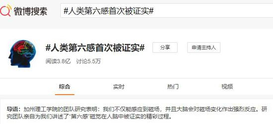 截至记者发稿时,被打上“人类第六感首次被证实”标签的微博话题阅读量,不到一天就达到3.8亿。