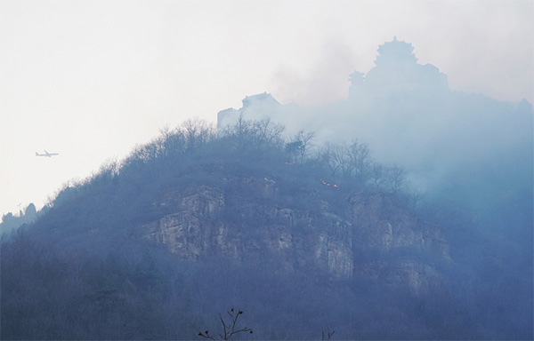 北京青年报记者注意到,丫髻山的山顶有亭子等建筑物,也被火势包围。随着风力时大时小,山顶上不时还能看到多处明火。在附近的村庄中,能够听到村里向村民传授防火知识的广播,希望村民注意安全。