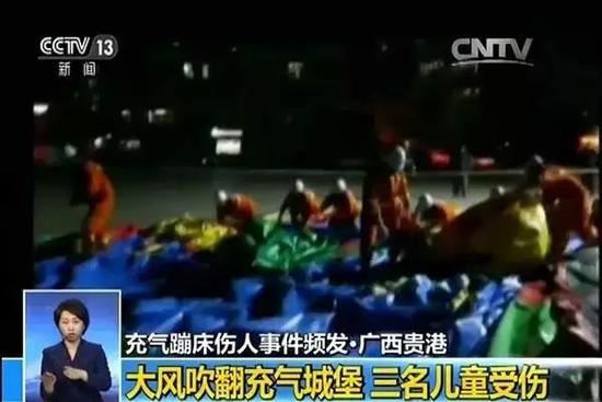 2016年2月,广西贵港一场突如其来的大风,三四米高的充气城堡没有固定好,发生了侧翻。事故致2名儿童轻伤,一名8岁儿童重伤一度昏迷。