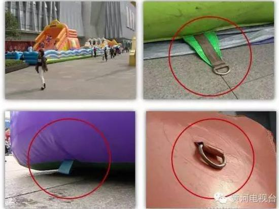 这些充气城堡,虽然都配备了安装固定装置的锁扣,但是都处于闲置状态。