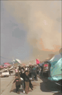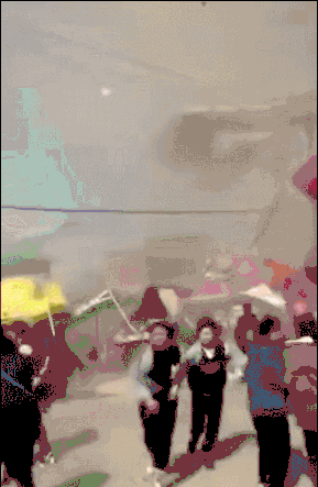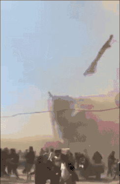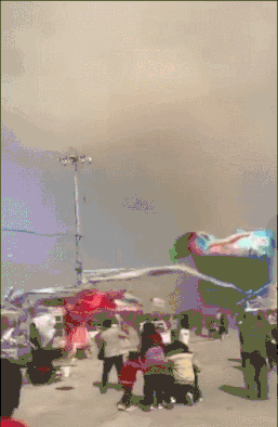 从现场图片中可以看到,尘卷风直接将蹦蹦床卷飞,附近人群惊慌向外逃走,看起来十分吓人。