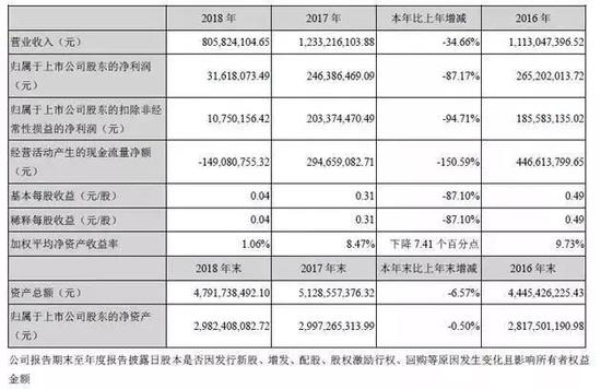 年报显示,公司营业收入8.06亿元,归属于上市公司股东的净利润为3161.81万元,后者较上年同期大幅下降87.17%。而在2016年、2017年,公司归属于上市公司股东的净利润分别为2.65元和2.46亿元。公司基本每股收益0.04元/股,相比2017年减少87.1%。
