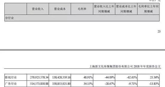 每日经济新闻(微信号:nbdnews)记者注意到,除了并购周星驰公司PDAL、投资影视项目外,新文化最大的收入来源是广告板块,近年来其营收超50%都是来自广告。公告显示,2018年新文化广告收入5.15亿元,占营收比重高达63.86%,较去年同期下滑了28.67%。值得注意的是,从毛利率上来看,影视板块为48.91%,比去年同期增加了25.36%,但广告板块的毛利率仅为34.15%,不仅低于影视板块,而且同比下滑13.83%。