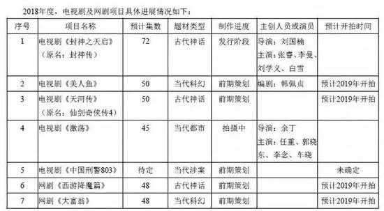 电视剧方面,《天乩之白蛇传说》和《胜利之路》分别在去年7、8月播出;《封神之天启》《亮剑之雷霆战将》《亲爱的设计师》等项目已进入发行或排播阶段,其中《封神之天启》于报告期内取得了发行许可证,并签约主流视频播放平台;《亮剑之雷霆战将》已签约一线卫视及主流视频播放平台。