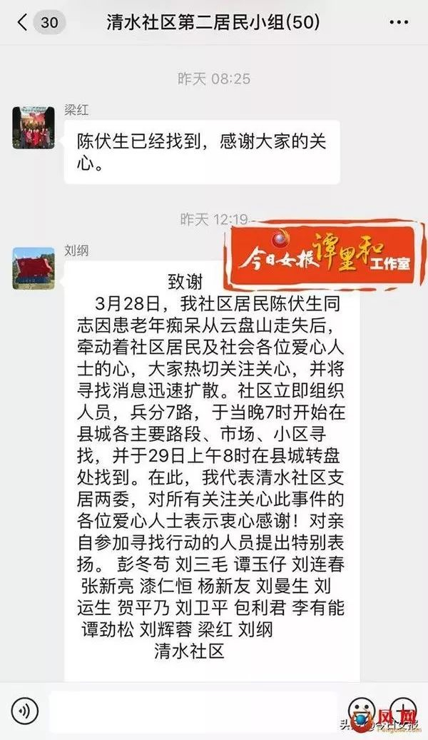 老人被找到后,居委会主任刘纲在微信群中感谢大家,还提出特别表扬。