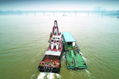 在402拖船推动下,鄂航四码头和五码头的两艘趸船向长江上游驶去 |