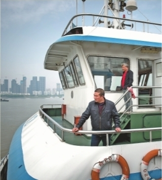 武汉市唯一的汽渡航线停航当天,调度员余立斌(左)、“江城汽渡02号“船长罗志泉(右)站在驾驶室外望着江面 |
